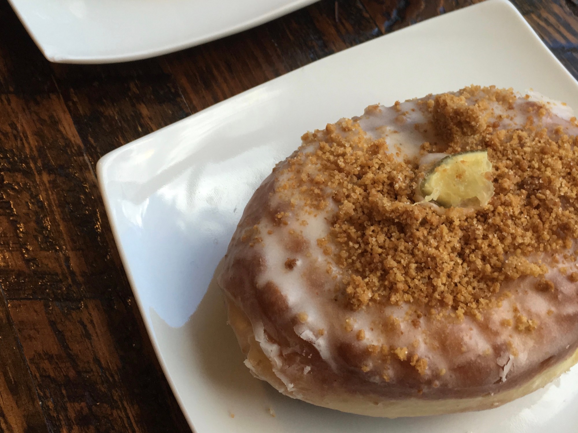 I got the Key Lime Pie donut, made of lime-zested dough, filled with key lime curd, topped with a graham cracker strudel and a lime glaze with a teeny lime slice on top. Sounds amazing right? It tasted amazing too. I was one of those people, I had to eat my donut with a knife and a fork because it was so big and rich. The outer parts were a little too bready without the filling, but it was great overall.