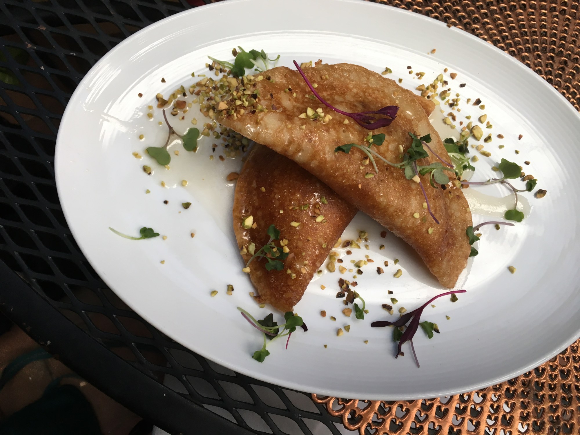 I ordered the “Qatayef” for my meal. These were two Syrian-style stuffed pancakes. I’m not sure what I was expecting, but it was definitely not this! It was a very unique and non-traditional dish for sure. It was a spongy sweet dough, almost like a thick dosa or a sweet injera. One had a creamy orange ricotta stuffing, and the other had a walnut sauce stuffing. Both were topped with pistachios and a rose water syrup.