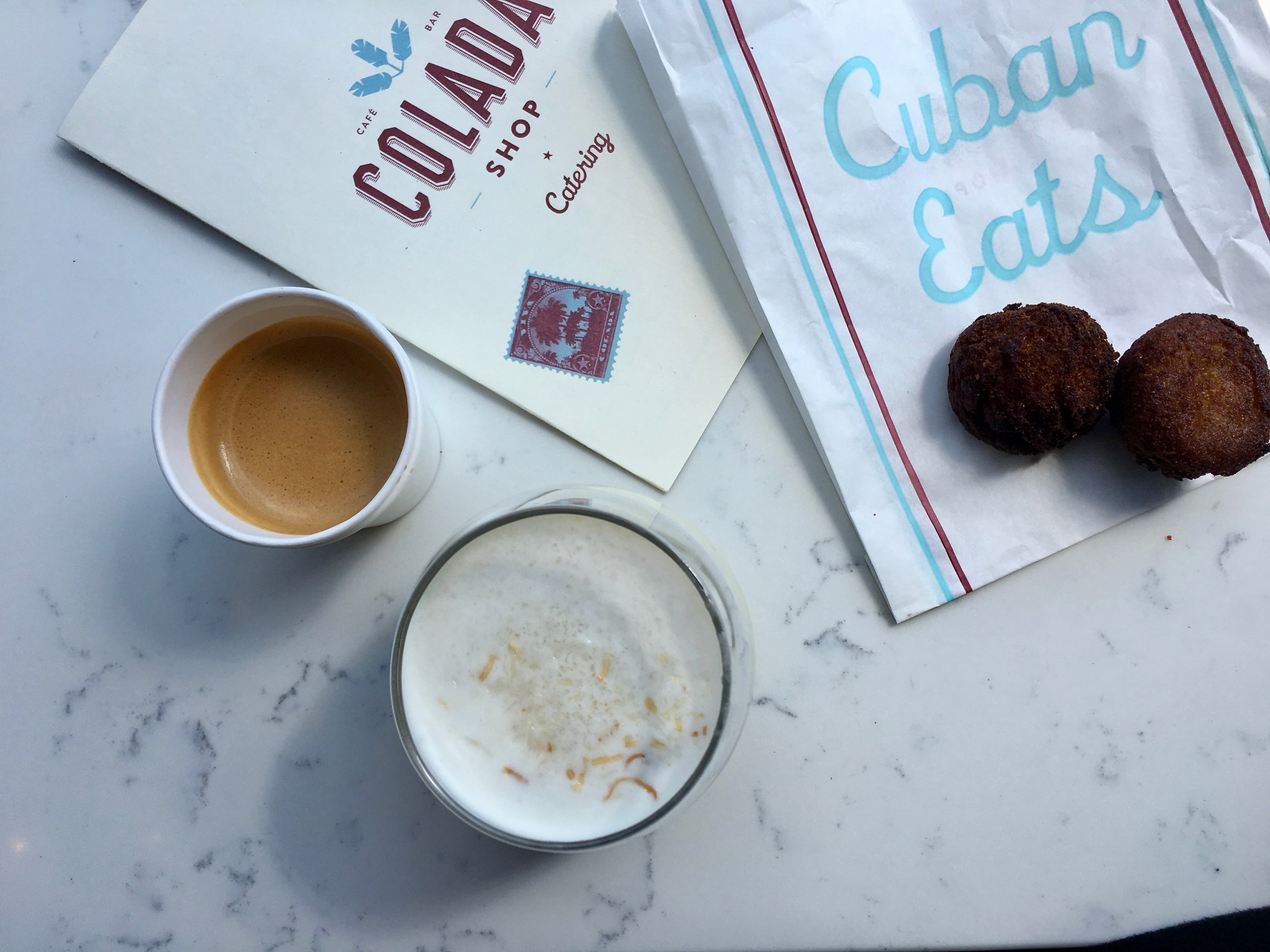 Colada Shop is a Cuban restaurant, serving coffee drinks, snack-size portions of traditional cuban food, sandwiches, and cocktails. I love that this menu setup can cater to a variety of crowds: remote workers who need coffee and wifi, wanderers stopping in for a quick snack of empanadas or pastelitos, or cocktails as a first stop on an evening out. The shop has inside seating for workers and chatters, a beautiful bar overlooking the street, and outside tables.