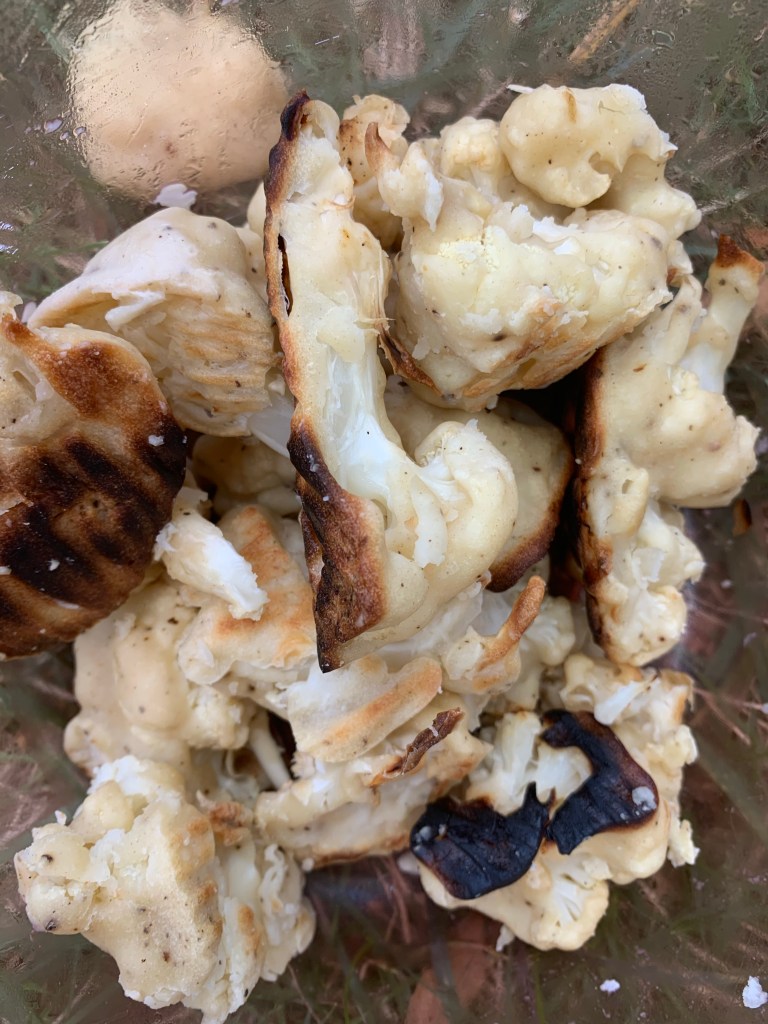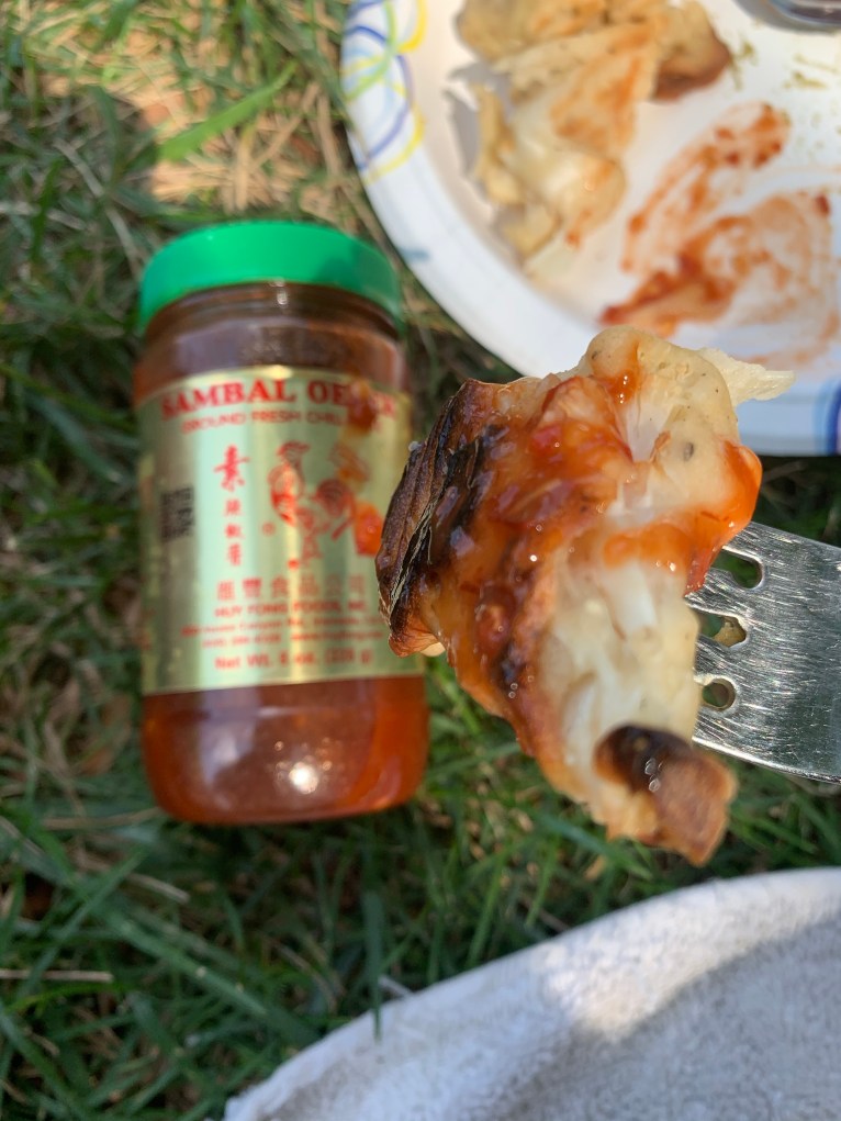 to do this in the park in a socially distanced manner, we came prepared with separate plates and utensils and a big batch of homemade cauliflower wings. I used this recipe from Delish – and while these were pretty decent for being vegan and homemade, I think they’d be 10x better if made in an air fryer or a convection oven. the once-crispy batter softened up in my 90-degree-heat walk to the park and as you can see, some are a ‘lil burnt. regardless, I made a huge batch with one head of cauliflower that was enough for 4 people, and it was much cheaper than getting tons of wings.